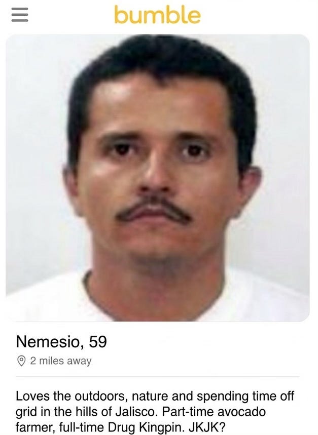 At 3:13am on February 13 — following a long day lining his compound with landmines — El Mencho created a Bumble profile, according to information obtained from the dating app. On his profile, El Mencho uploaded his DEA Most Wanted headshot, included his real name and wrote “Drug Kingpin” for his occupation, according to screenshots seen by La Chancla News.